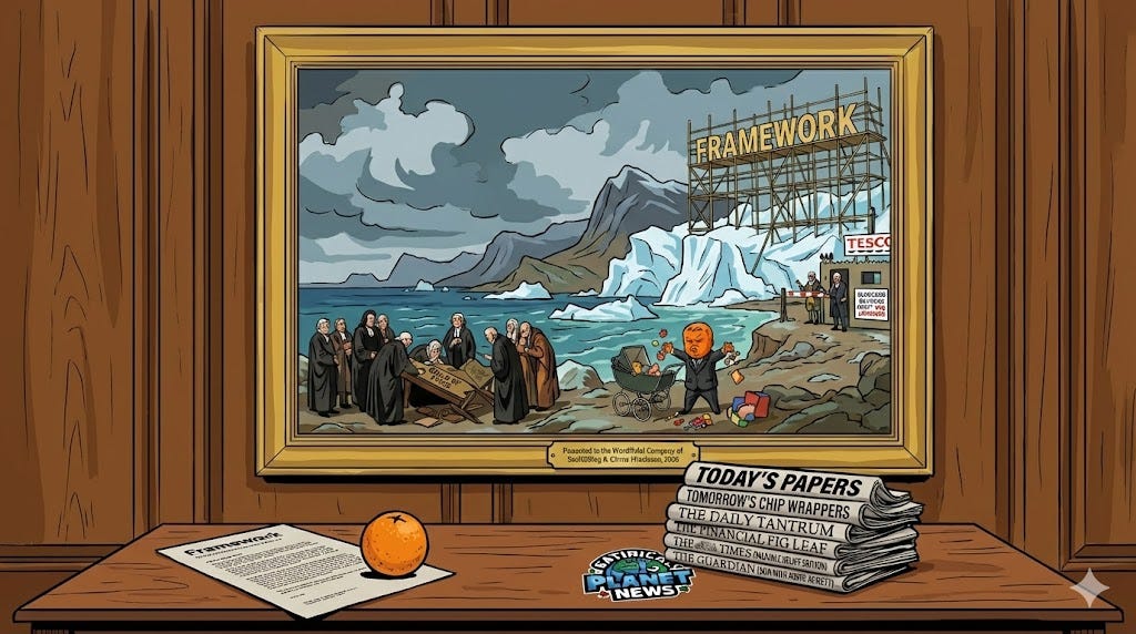 So that’s Thursday’s front pages. Trump says he has a “framework” for Greenland and the entire Arctic region, drops tariff threats, and markets cheer like they’ve been granted permission to breathe. Broadsheets launder coercion into “productive meetings” and “future discussions”. Tabloids split the day between manbaby mockery and pastry sedation. And threaded through the whole lot like the real national constitution, Tesco oranges at 99p, Clubcard required.
